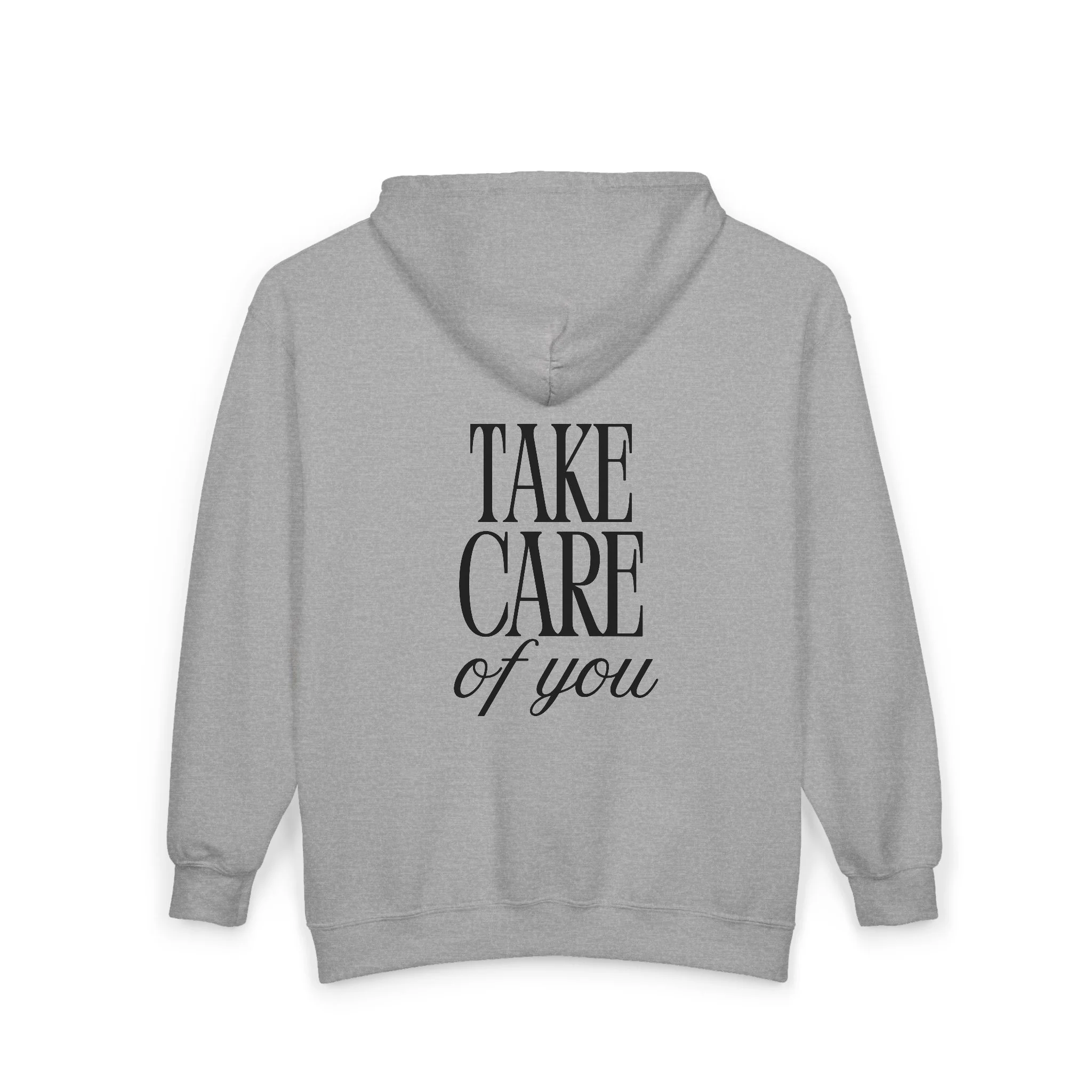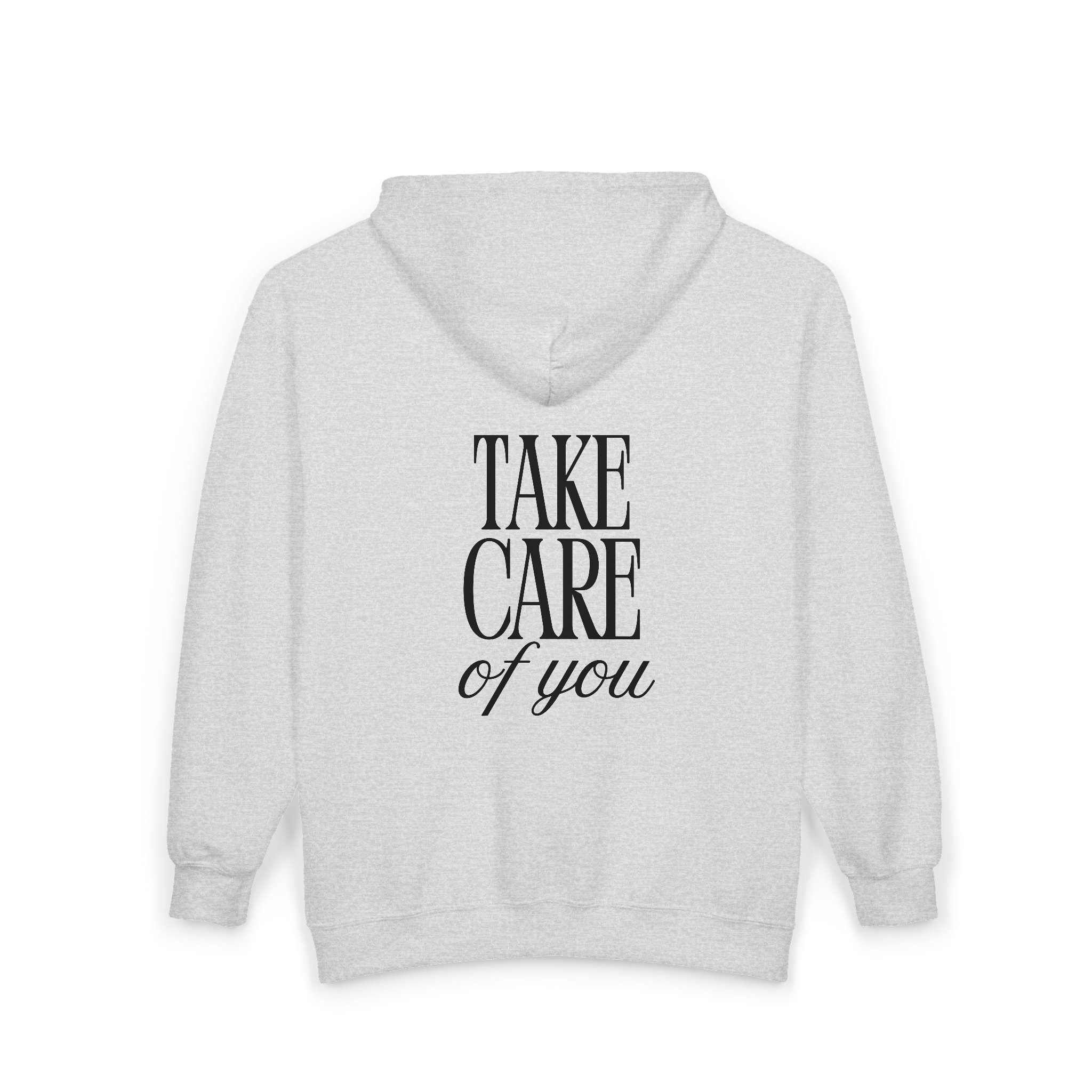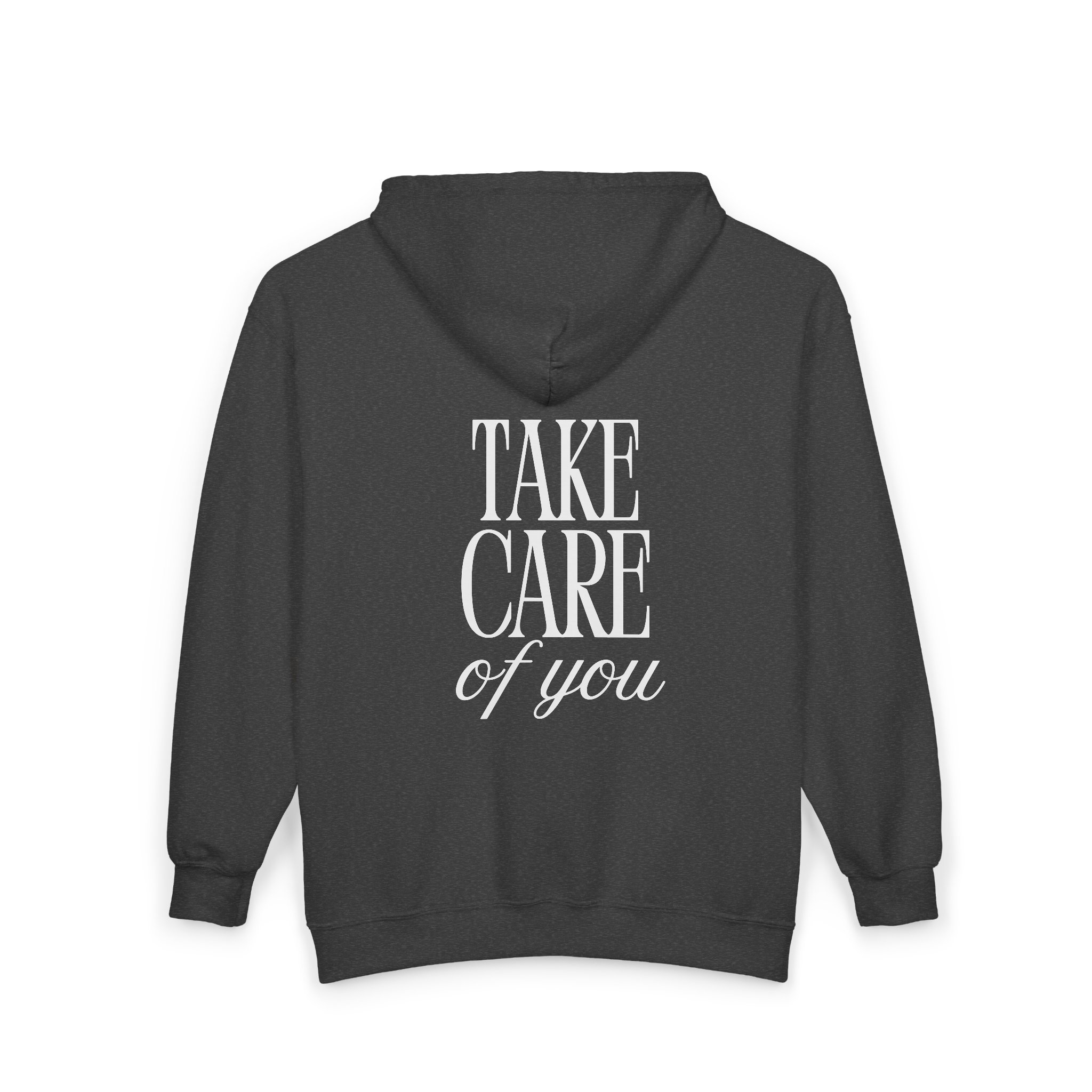effortless to throw on, impossible to take off — your go-to zip-up hoodie for comfort that stays with you. bold message on the back that reminds everyone (including you) what matters most.